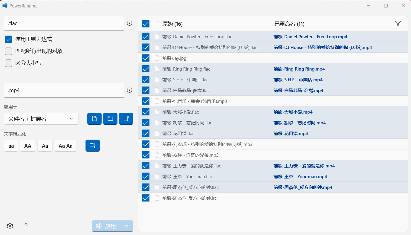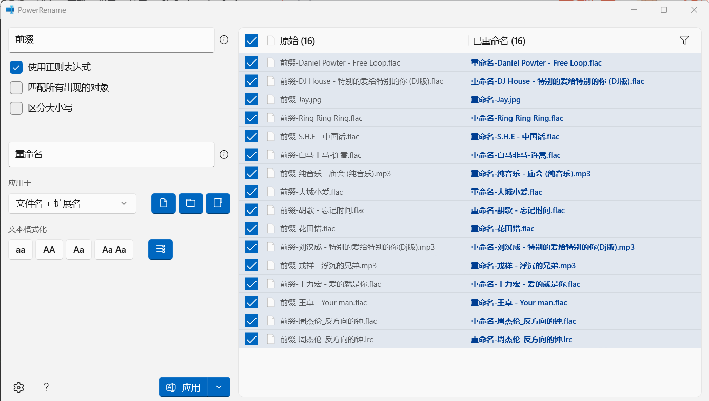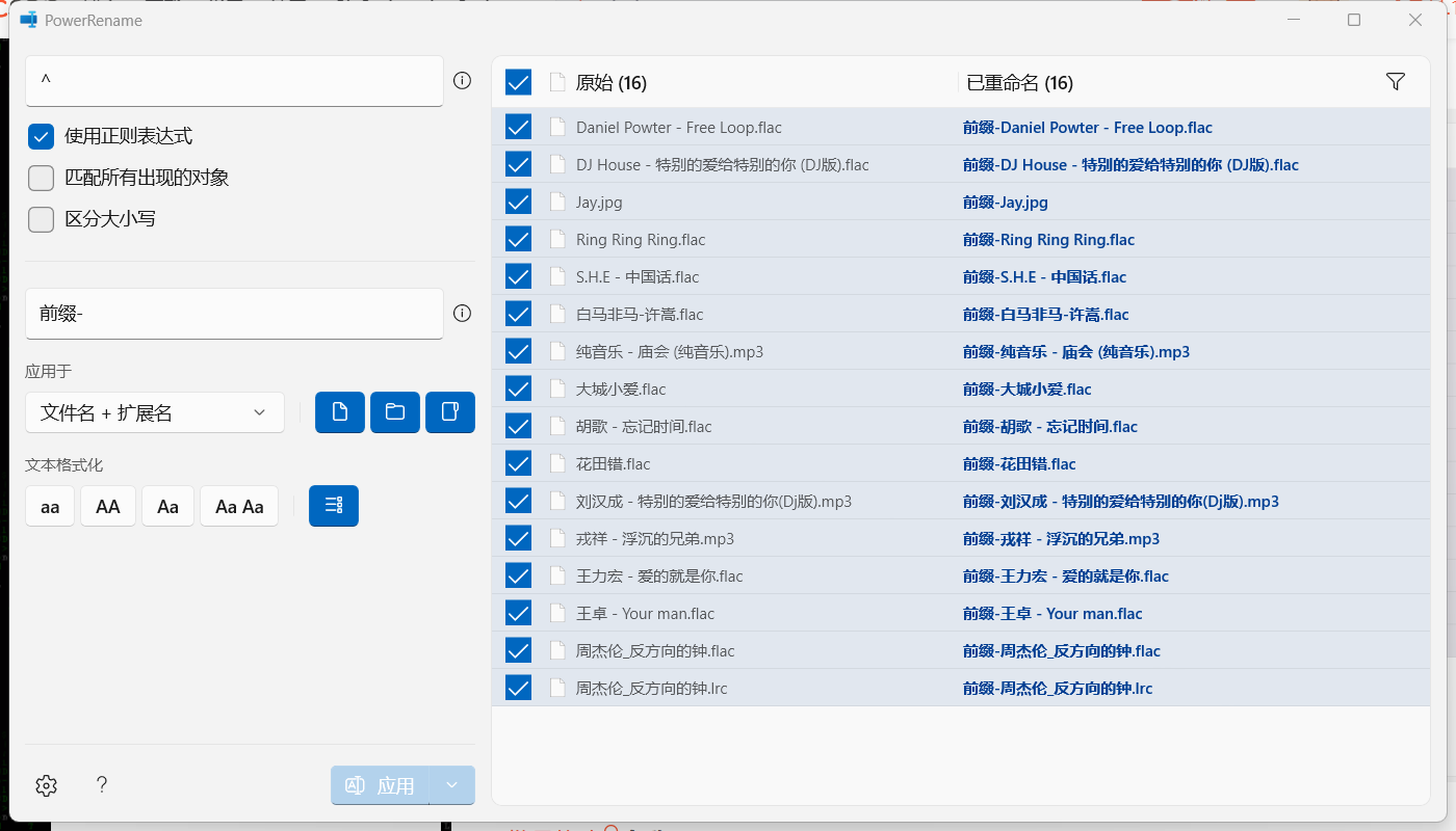 选中使用正则表达式,上边输入^表示匹配开头,下边输入要加的前缀名称,右边会出现重命名的预览项,最后点击应用就完成了。